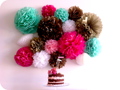 Decoración de aniversario, pared de pompones cromática y pastel diseñado por nosotros