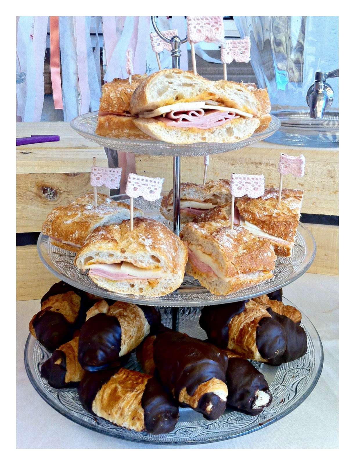 Detalle de las banderillas (toppers) especiales para el primer cumpleaños de Lia, dibujos animados y lace tape en rosa bebé super dulce y vintage.